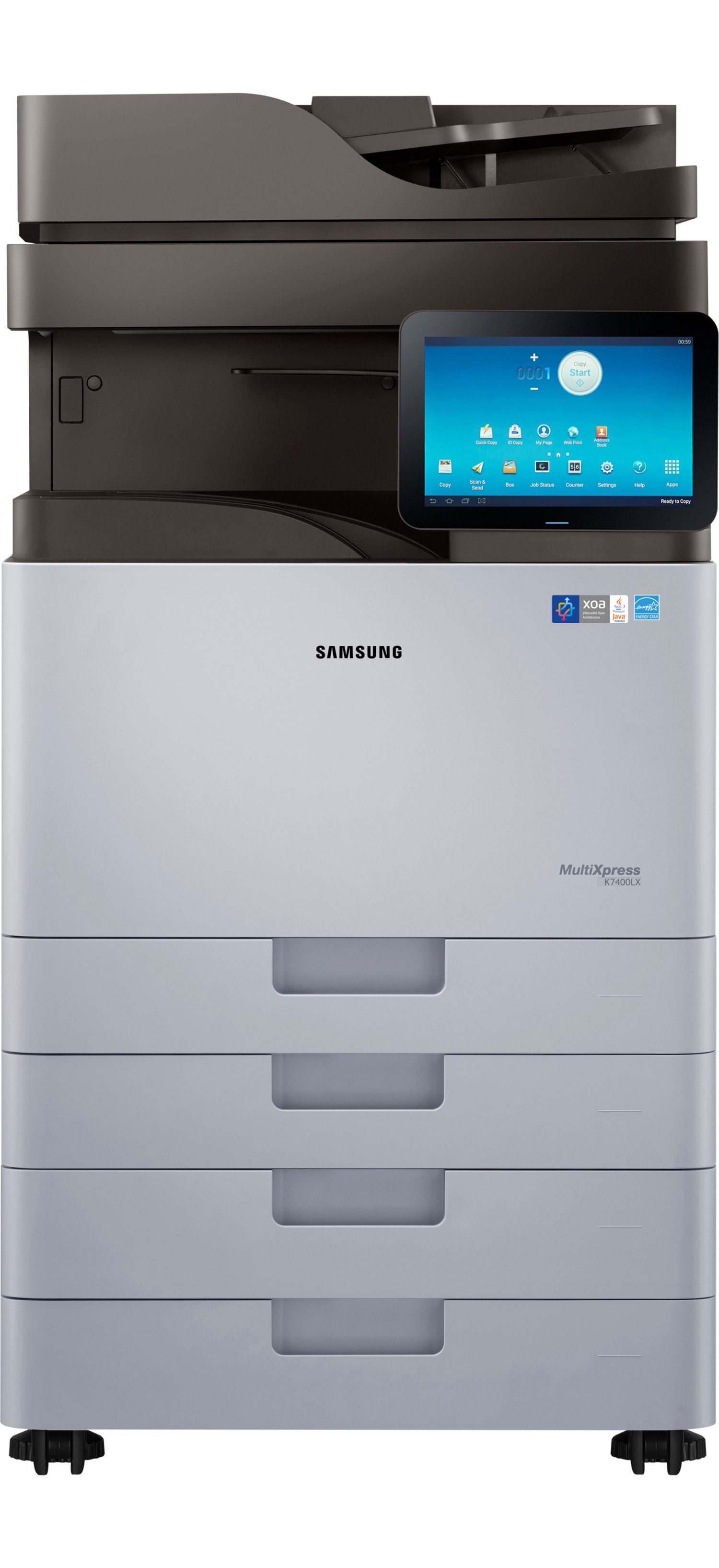 The Samsung SL-K7400LX laser printer model has a quad-core 1.5 GHz CPU with System-on-Chip technology that provides top quality interpreting and rendering emulation, which makes this model as fast as more basic dual-core based multifunction printers. The Laser Beam Scanning Unit (LSU) produces a 1200 x 1200 dpi resolution, while the Rendering Engine for Clean Page (ReCP) technology sharpens both text and graphics. Its comprehensive open UX system is powered by Android, and the Samsung Smart UX Centre works like a tablet with intuitive touch to print 960 x 600 dpi resolution display. The NFC-supported mobile device means its easy to tap to print, scan or fax documents, and the wireless option with NFC Pro enables user authentication through a mobile device.
